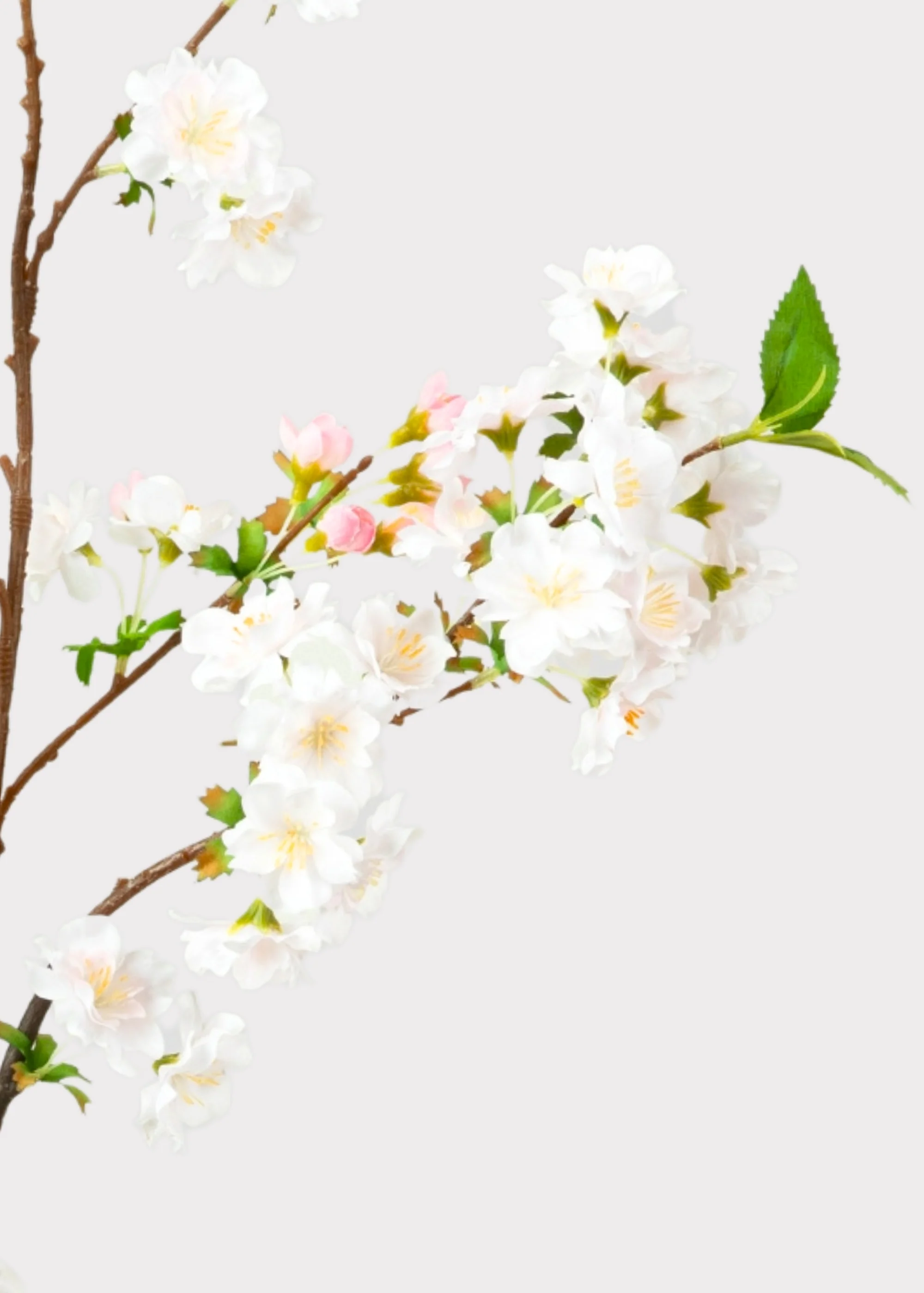 Indulge in Spring's beauty all year long with faux-ever blooming botanicals that offer permanence, including this gorgeous cherry blossom branch. It has elegant white artificial flowers accentuated with pops of delicate blush pink color, resulting in an exquisite replica of nature. Add lifelike faux cherry blossoms to your Spring wedding bouquet, or style a stunning arrangement for your elevated home decor.