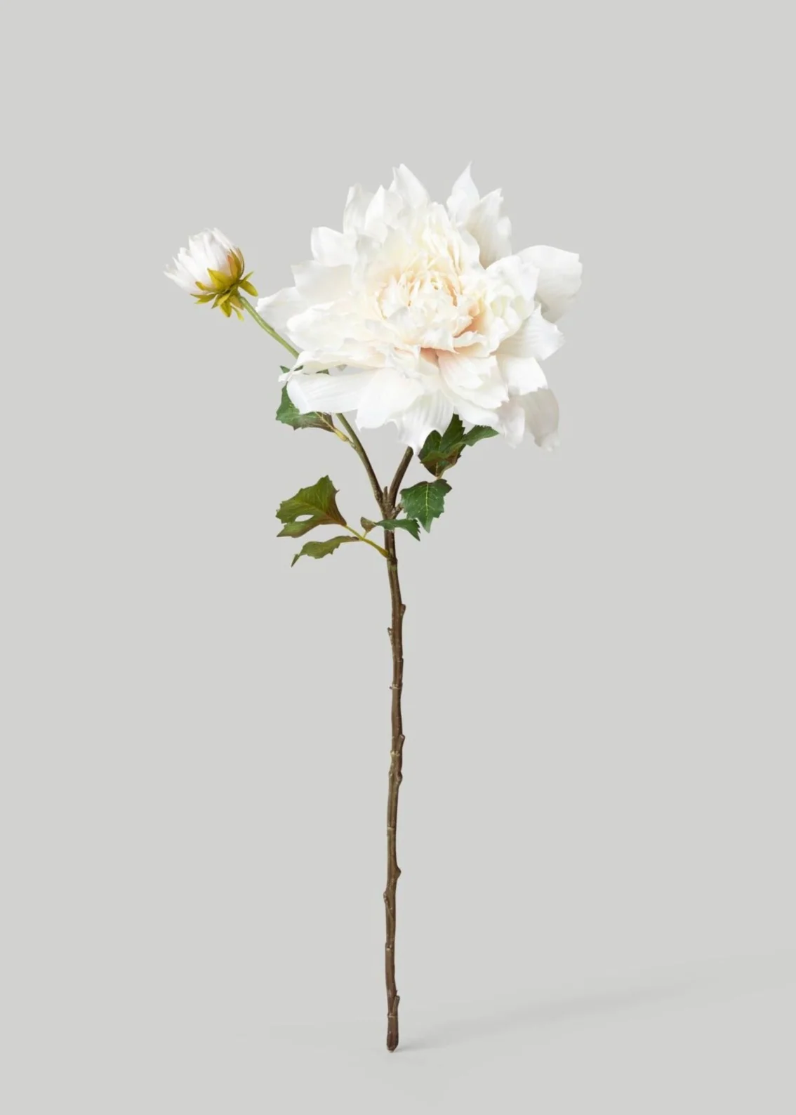A dramatic and sophisticated faux floral arrangement starts with this elegant cream white silk dahlia flower stem that has soft and subtle light blush tones. The extremely realistic botanical details make this oversized, beautiful dahlia bloom a superior replica of nature. Style one or several artificial dahlias in a statement vase, and you have a permanent blooming centerpiece that elevates any space in your home with a classic, timeless feeling!