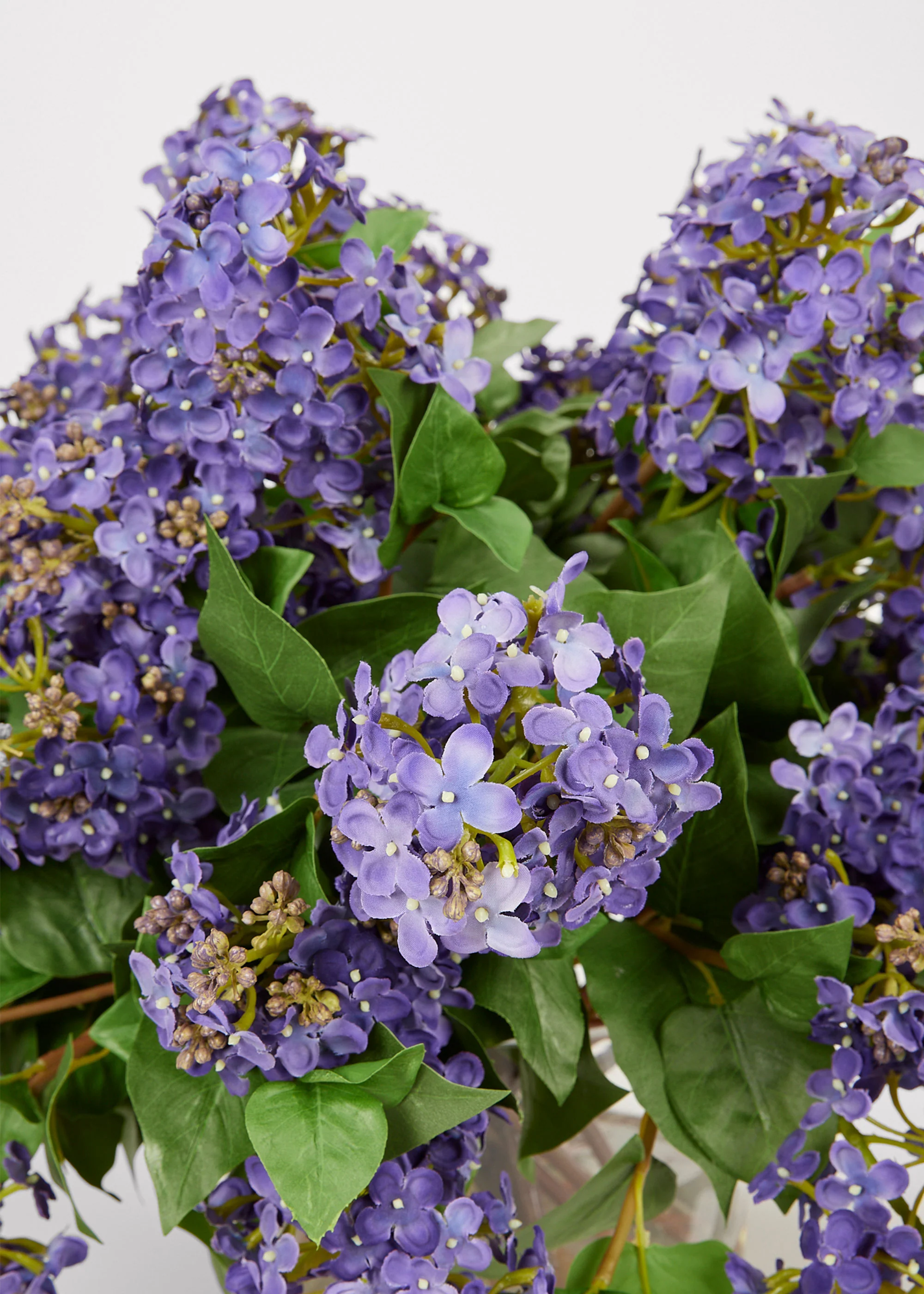 Elevate your home decor and interior spaces with this artificial blooming flower arrangement full of lush lilacs in a beautiful purple and blue violet hue. Already arranged in a glass vase, this faux Spring lilac floral design perfectly recreates a fresh botanical look that only nature can offer. Place it on a table or a mantel in your living room and enjoy the luxury of life-like flowers that last. Stems are styled in acrylic water and cannot be removed.
